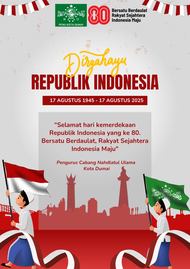 PENGURUS CABANG NAHDLATUL ULAMA KOTA DUMAI Mengucapkan Selamat HUT ke-80 RI, semoga Indonesia makin maju, makin kuat, dan makin sejahtera rakyatnya!